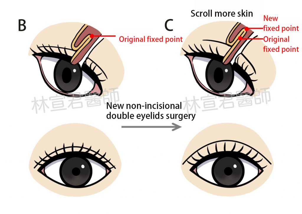 Make a higher turning point inside which more skin can scroll, and let B become C, so the double eyelids can be more obvious like in the youth!