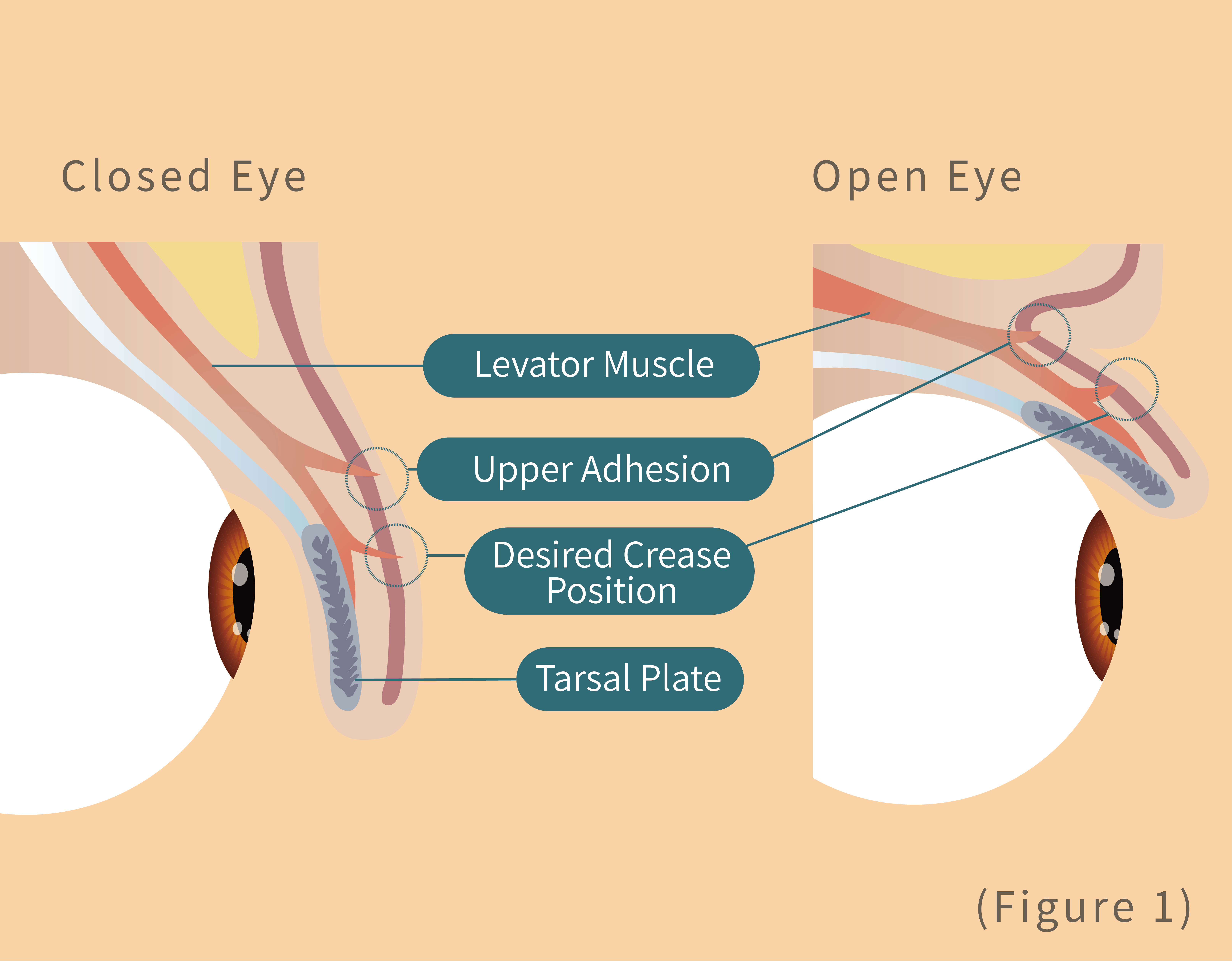 In principle, revision requires releasing the original high or overly deep adhesions and redesigning the crease at a lower and more natural position. However, the crease may easily re-adhere at its previous location. Therefore, in addition to carefully separating the adhesions, the surgeon must understand the anatomical relationships of the eyelid during eye movement, rearrange the tissues appropriately, and perform measures to prevent re-adhesion.
