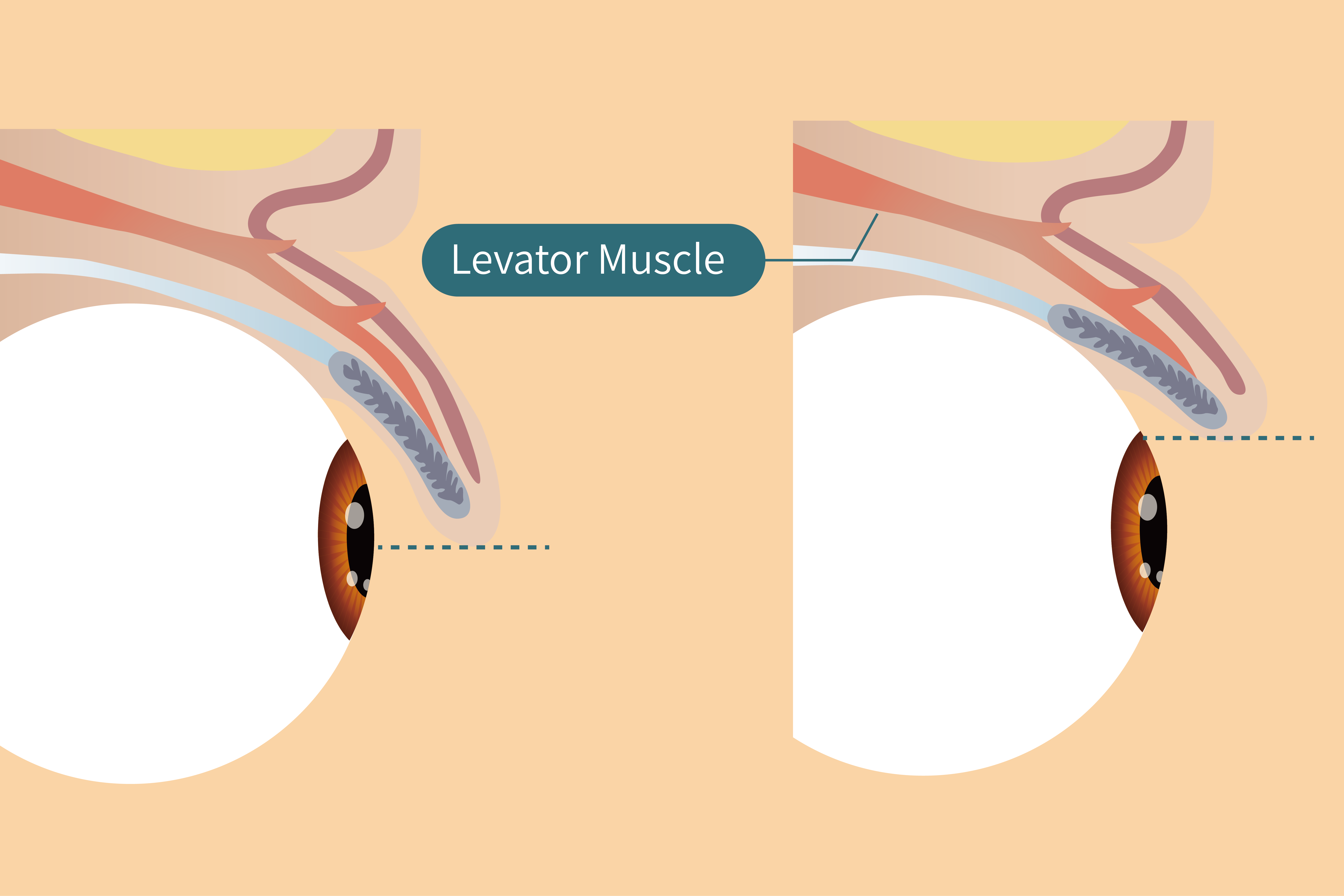 Eyelid ptosis refers to the downward position of the tarsal plate—the firm structure located beneath the eyelid skin near the eyelid margin. The levator muscle functions like a hand that lifts the tarsal plate; when it contracts, it pulls the eyelid margin upward, exposing the iris and allowing the eye to open. If the levator muscle is weak, the lifting force becomes insufficient, causing the tarsal plate—and thus the eyelid margin—to continue covering part of the iris even when the eyes are open. This levator-related dysfunction is what we refer to as true eyelid ptosis. Although the tarsal plate is not visible externally, we can infer its position and the strength of the levator muscle by observing the location of the eyelash root, which serves as a surface indicator of the eyelid margin height.